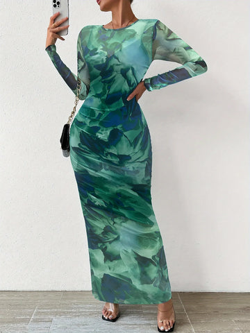 Women's dress, commuting tie dye pleated slim fit round neck long sleeved dress, autumn feminine temperament, high-end feeling