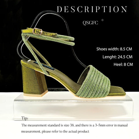 SPECIFICATIONSAfrican: Shoes And Bag To MatchBrand Name: RUTILANTClosure Type: buckle strapColor: Gold,Purple,Sky Blue,Silver,YellowDepartment Name: ADULTFashion Element: CRYSTALFit: Fits true to size, take your normal sizeGender: WOMENHeel Height: High (5cm-8cm),8 CMHeel Type: Round HeelHign-concerned Chemical: NoneInsole...